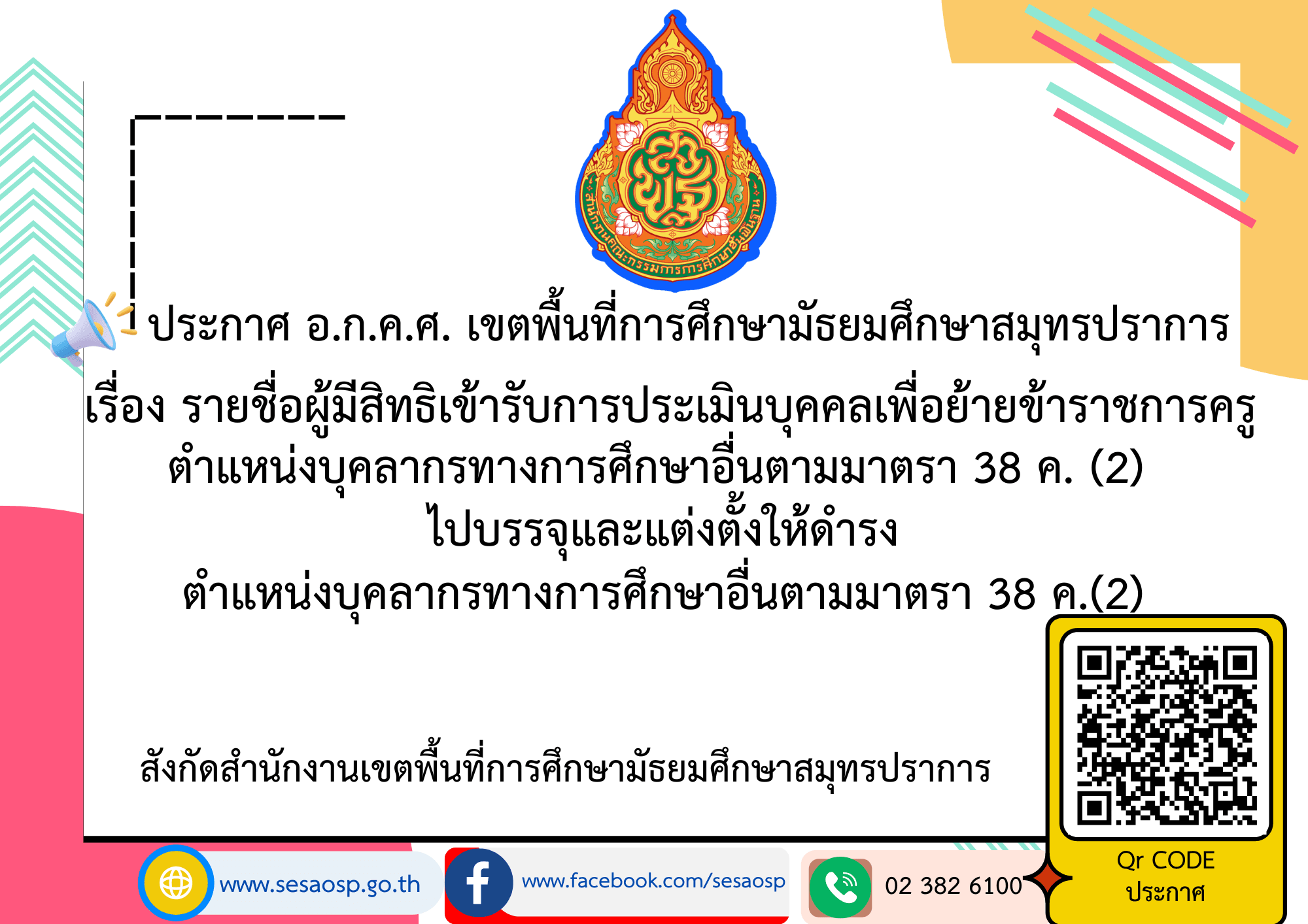 ประกาศ อ.ก.ค.ศ. เขตพื้นที่การศึกษามัธยมศึกษาสมุทรปราการ เรื่อง รายชื่อผู้มีสิทธิเข้ารับการประเมินบุคคลเพื่อย้ายข้าราชการครู ตำแหน่งบุคลากรทางการศึกษาอื่นตามมาตรา 38 ค. (2)