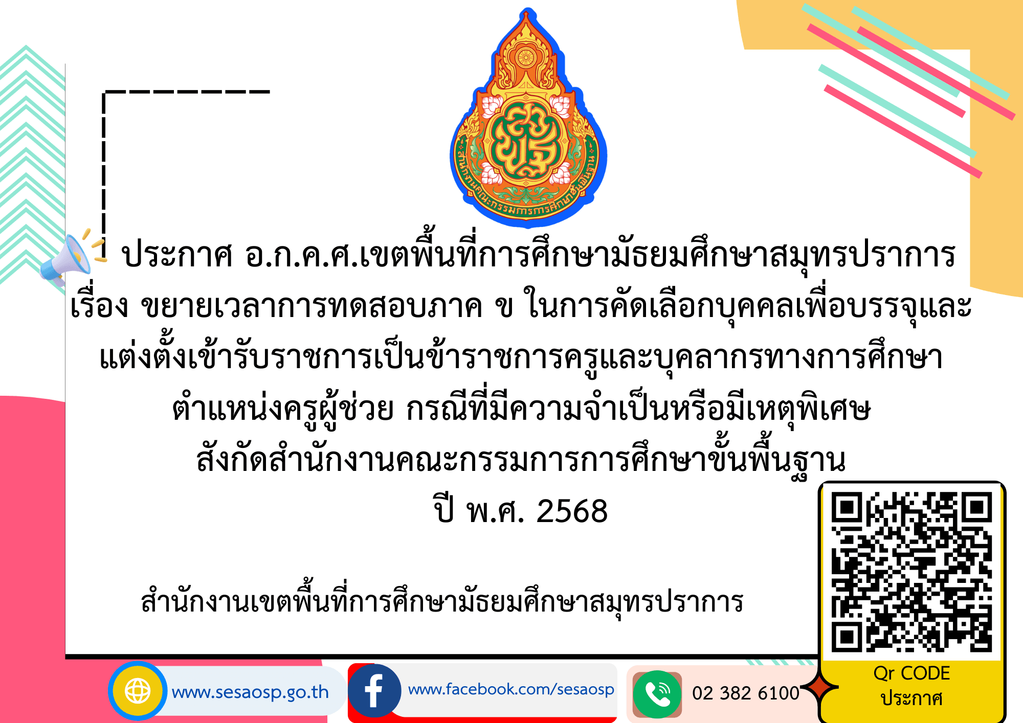 ประกาศ อ.ก.ค.ศ.เขตพื้นที่การศึกษามัธยมศึกษาสมุทรปราการ เรื่อง ขยายเวลาการทดสอบภาค ข ในการคัดเลือกบุคคลเพื่อบรรจุและแต่งตั้งเข้ารับราชการเป็นข้าราชการครูและบุคลากรทางการศึกษา ตำแหน่งครูผู้ช่วย กรณีที่มีความจำเป็นหรือมีเหตุพิเศษ สังกัดสำนักงานคณะกรรมการการศึกษาขั้นพื้นฐาน ปี พ.ศ. 2568