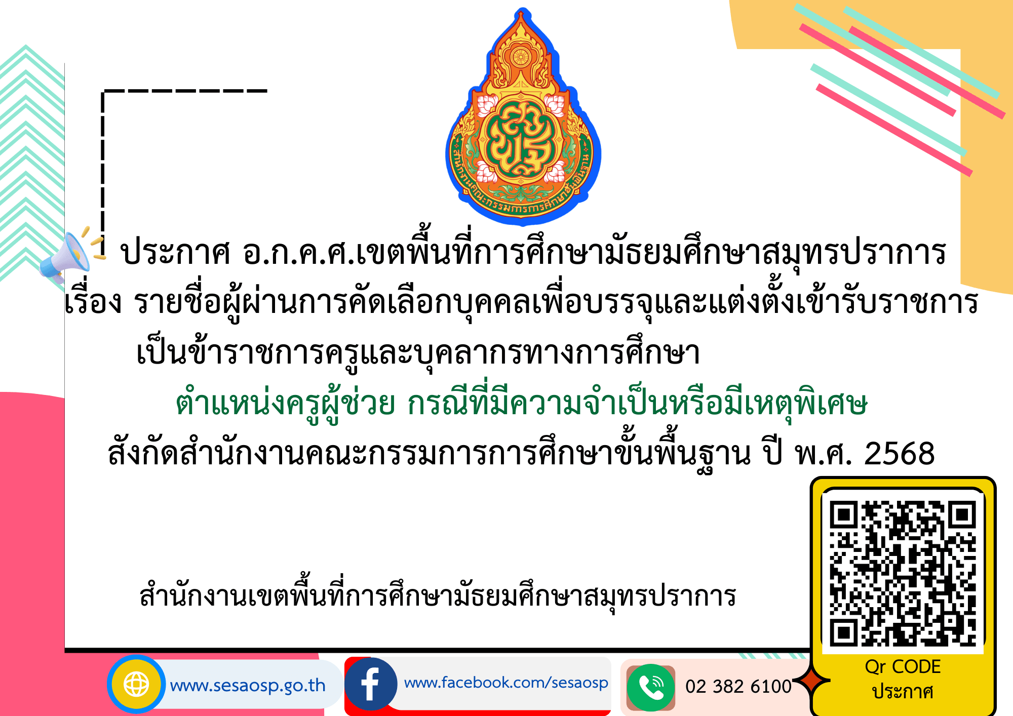 ประกาศ อ.ก.ค.ศ.เขตพื้นที่การศึกษามัธยมศึกษาสมุทรปราการ เรื่อง รายชื่อผู้ผ่านการคัดเลือกบุคคลเพื่อบรรจุและแต่งตั้งเข้ารับราชการ เป็นข้าราชการครูและบุคลากรทางการศึกษา ตำแหน่งครูผู้ช่วย กรณีที่มีความจำเป็นหรือมีเหตุพิเศษ สังกัดสำนักงานคณะกรรมการการศึกษาขั้นพื้นฐาน ปี พ.ศ. 2568