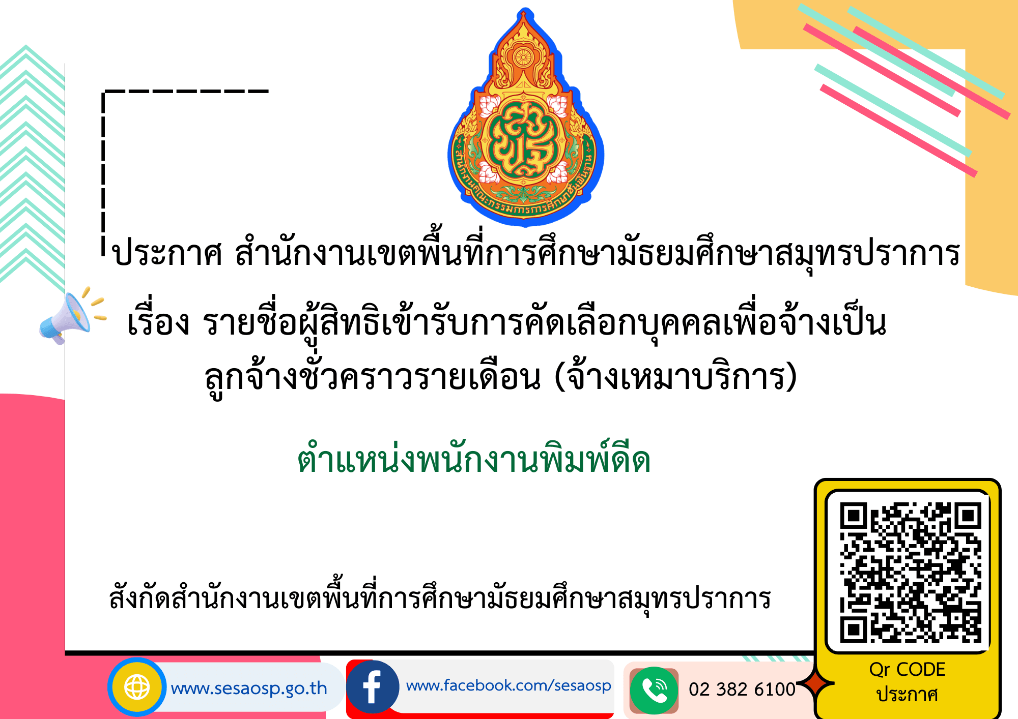 ประกาศ สำนักงานเขตพื้นที่การศึกษามัธยมศึกษาสมุทรปราการ เรื่อง รายชื่อผู้สิทธิเข้ารับการคัดเลือกบุคคลเพื่อจ้างเป็นลูกจ้างชั่วคราวรายเดือน (จ้างเหมาบริการ) ตำแหน่งพนักงานพิมพ์ดีด สังกัดสำนักงานเขตพื้นที่การศึกษามัธยมศึกษาสมุทรปราการ
