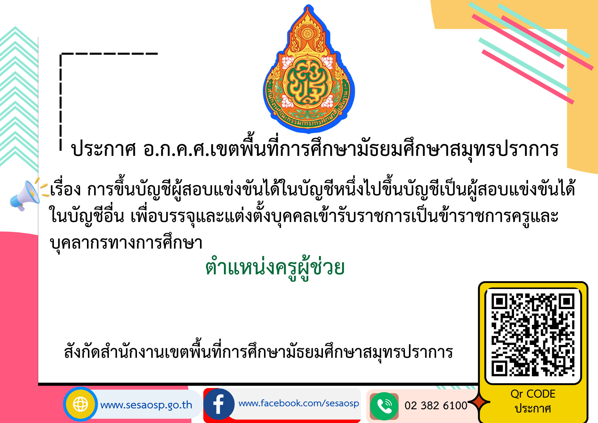 ประกาศ อ.ก.ค.ศ.เขตพื้นที่การศึกษามัธยมศึกษาสมุทรปราการ เรื่อง การขึ้นบัญชีผู้สอบแข่งขันได้ในบัญชีหนึ่งไปขึ้นบัญชีเป็นผู้สอบแข่งขันได้ ในบัญชีอื่น เพื่อบรรจุและแต่งตั้งบุคคลเข้ารับราชการเป็นข้าราชการครูและบุคลากรทางการศึกษา ตำแหน่ง ครูผู้ช่วย