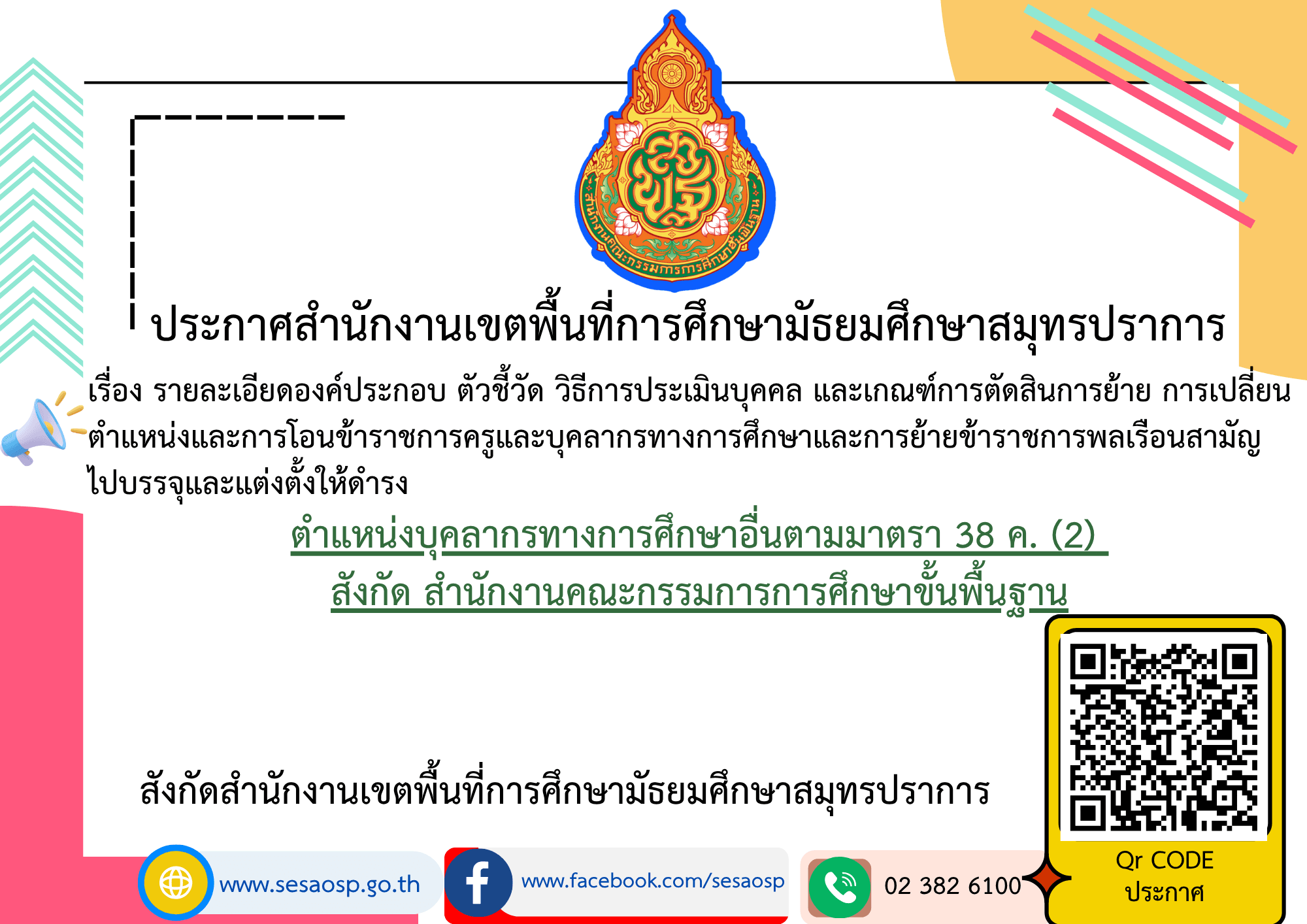 ประกาศ สพม.สมุทรปราการ เรื่อง ประกาศ สพม.สมุทรปราการ เรื่อง เรื่อง รายละเอียดองค์ประกอบ ตัวชี้วัด วิธีการประเมินบุคคล และเกณฑ์การตัดสินการย้าย การเปลี่ยนตำแหน่งและการโอนข้าราชการครูและบุคลากรทางการศึกษาและการย้ายข้าราชการพลเรือนสามัญไปบรรจุและแต่งตั้งให้ดำรงตำแหน่งบุคลากรทางการศึกษาอื่นตามมาตรา 38 ค. (2) สังกัด สำนักงานคณะกรรมการการศึกษาขั้นพื้นฐาน